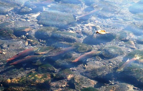 2009年10月19日 屈斜路湖 屈斜路湖の湖畔林道で車を停めて湖の縁まで歩いていくと、たくさんの魚たち(鱒の仲 間でしょう)が群れていました。手網でもあればいくらでも獲れそうです。みんな婚姻色 に身を染め上げています。掴まえて腹を割けばスジコや白子で…